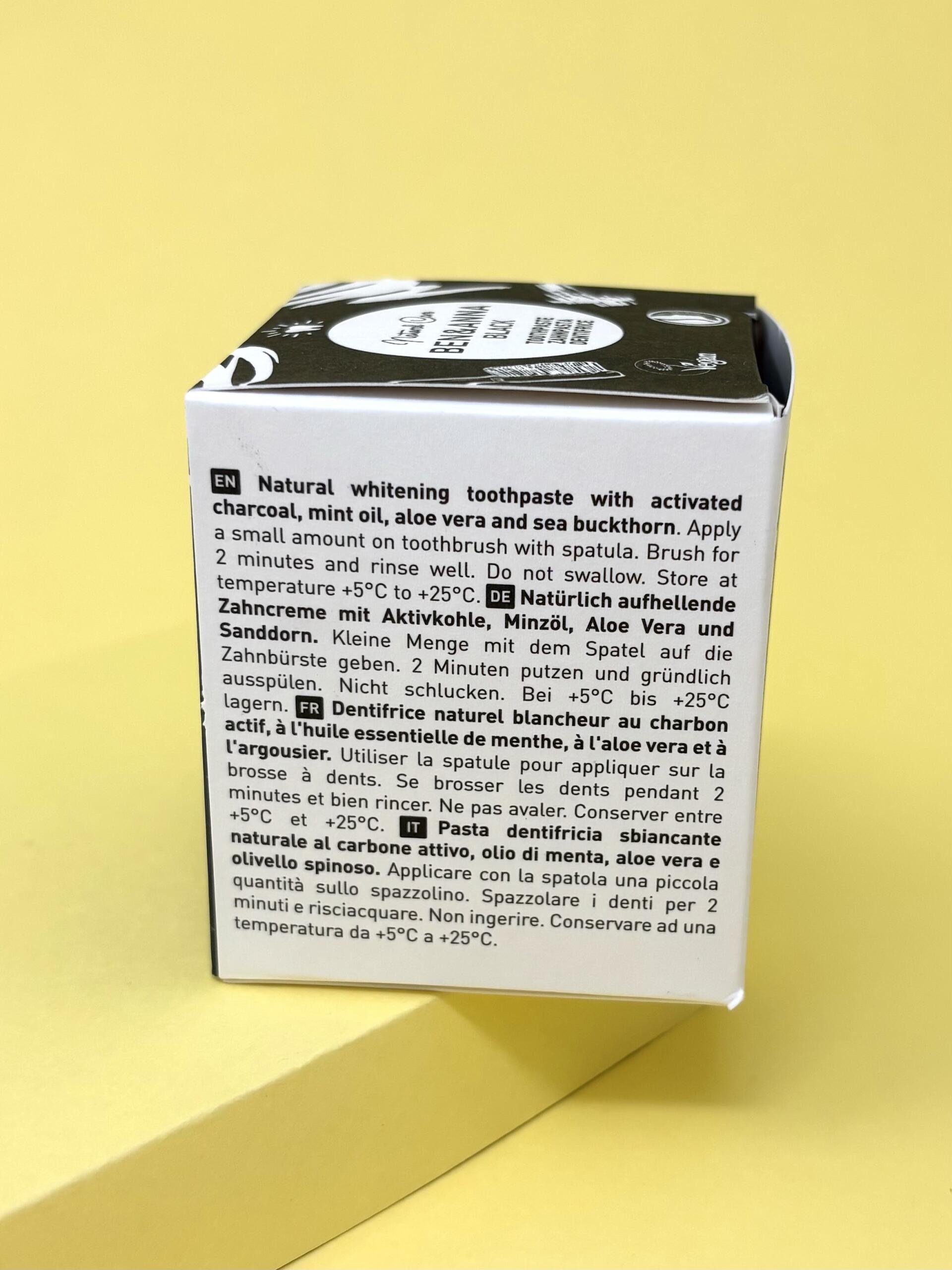Dentifrice noir au charbon actif pour blanchiment, argousier et camomille.