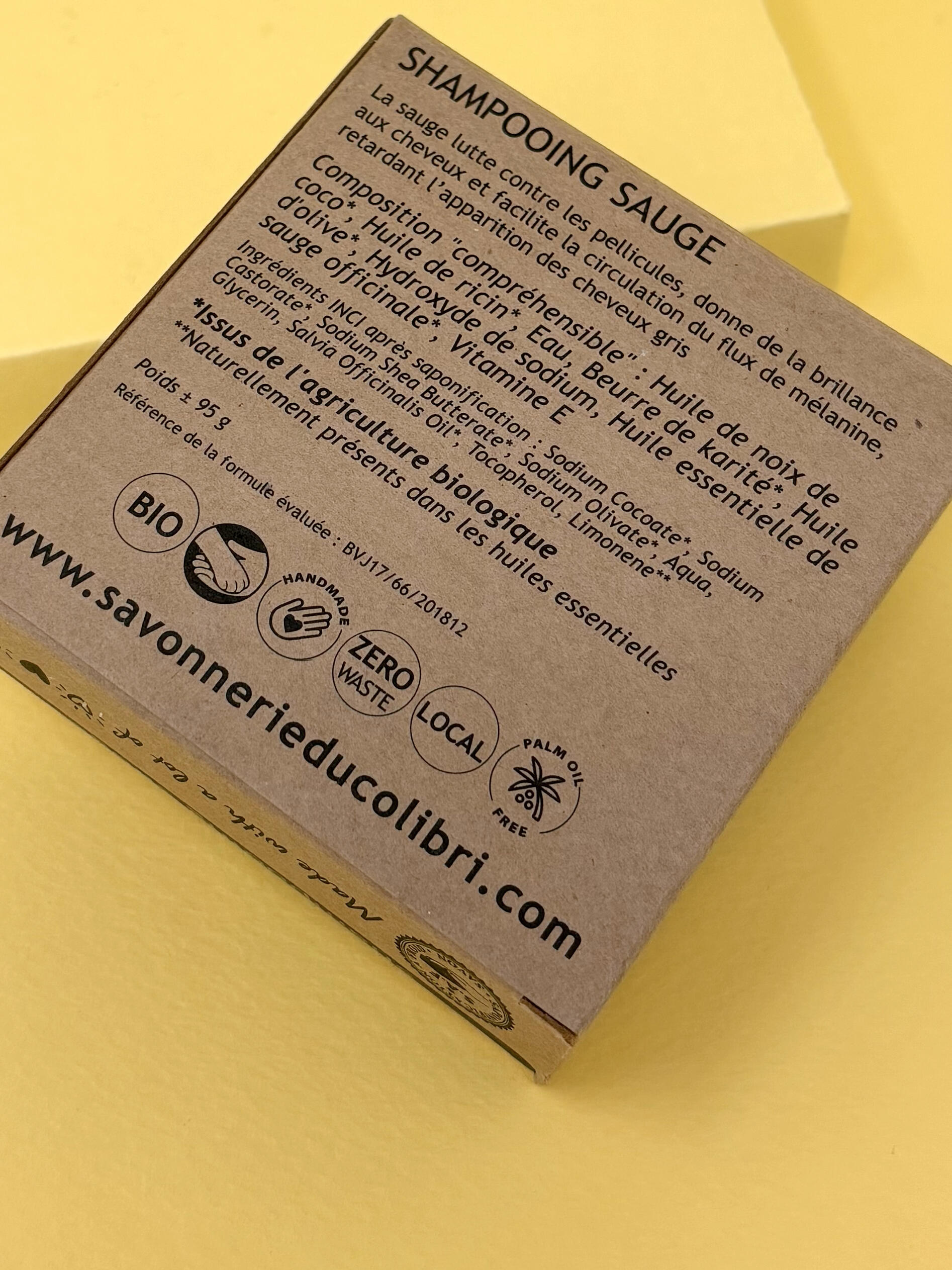 Shampoing solide à la sauge, idéal pour les cheveux normaux à gras, purifie et équilibre le cuir chevelu.