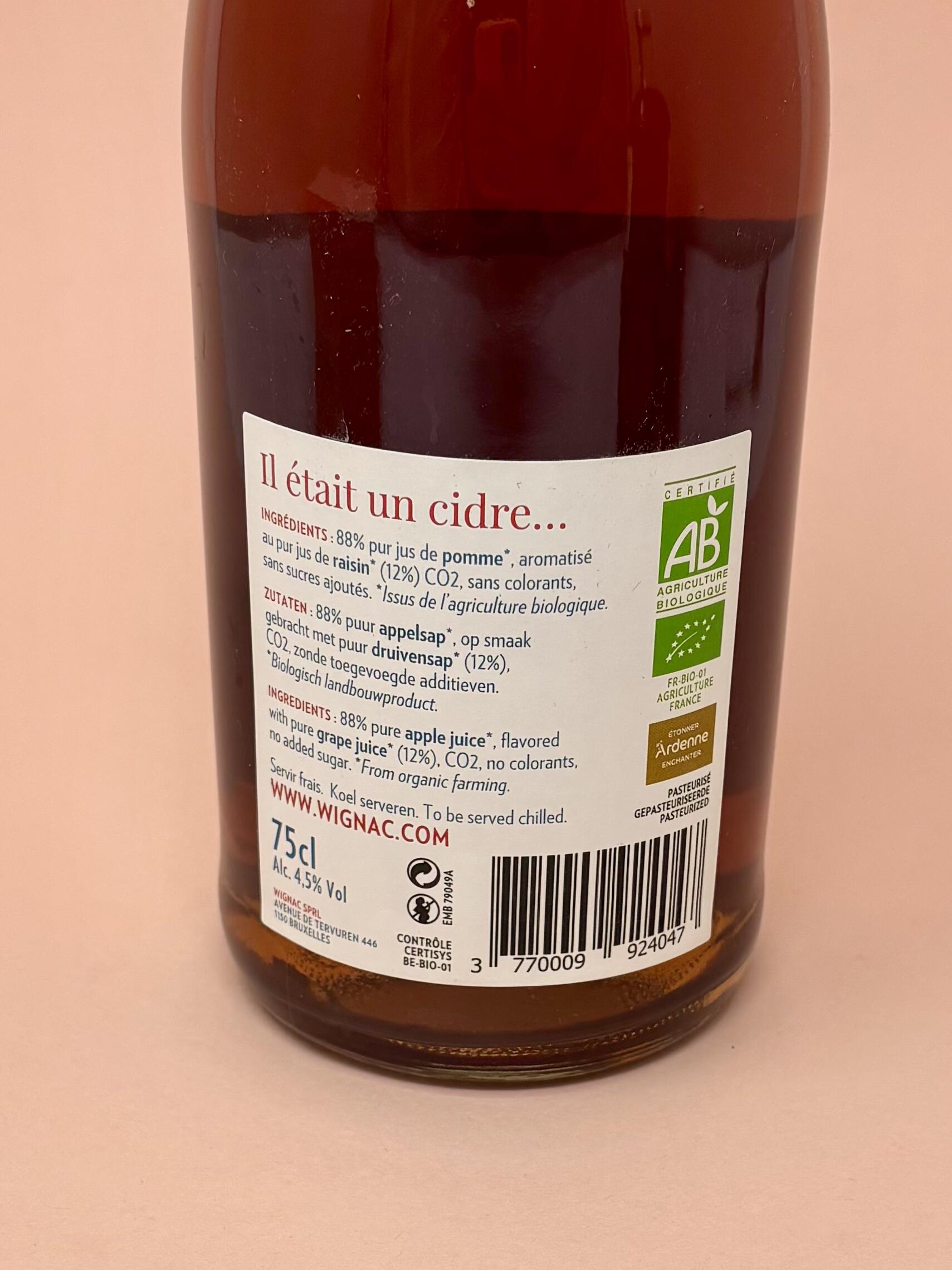 Ce cidre rosé artisanal marie 88 % de cidre de pommes bio et 12 % de pur jus de raisin, pour des notes fruitées et légèrement sucrées. Sans sucre ajouté, sans colorant ni sulfite, il offre une alternative naturelle, rafraîchissante et originale. Produit dans les Ardennes par la maison familiale Wignac, il est naturellement sans gluten et certifié biologique.