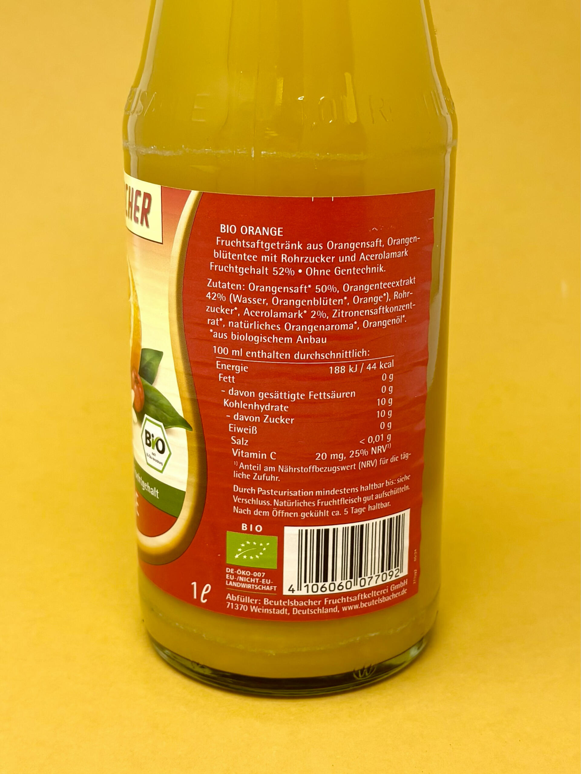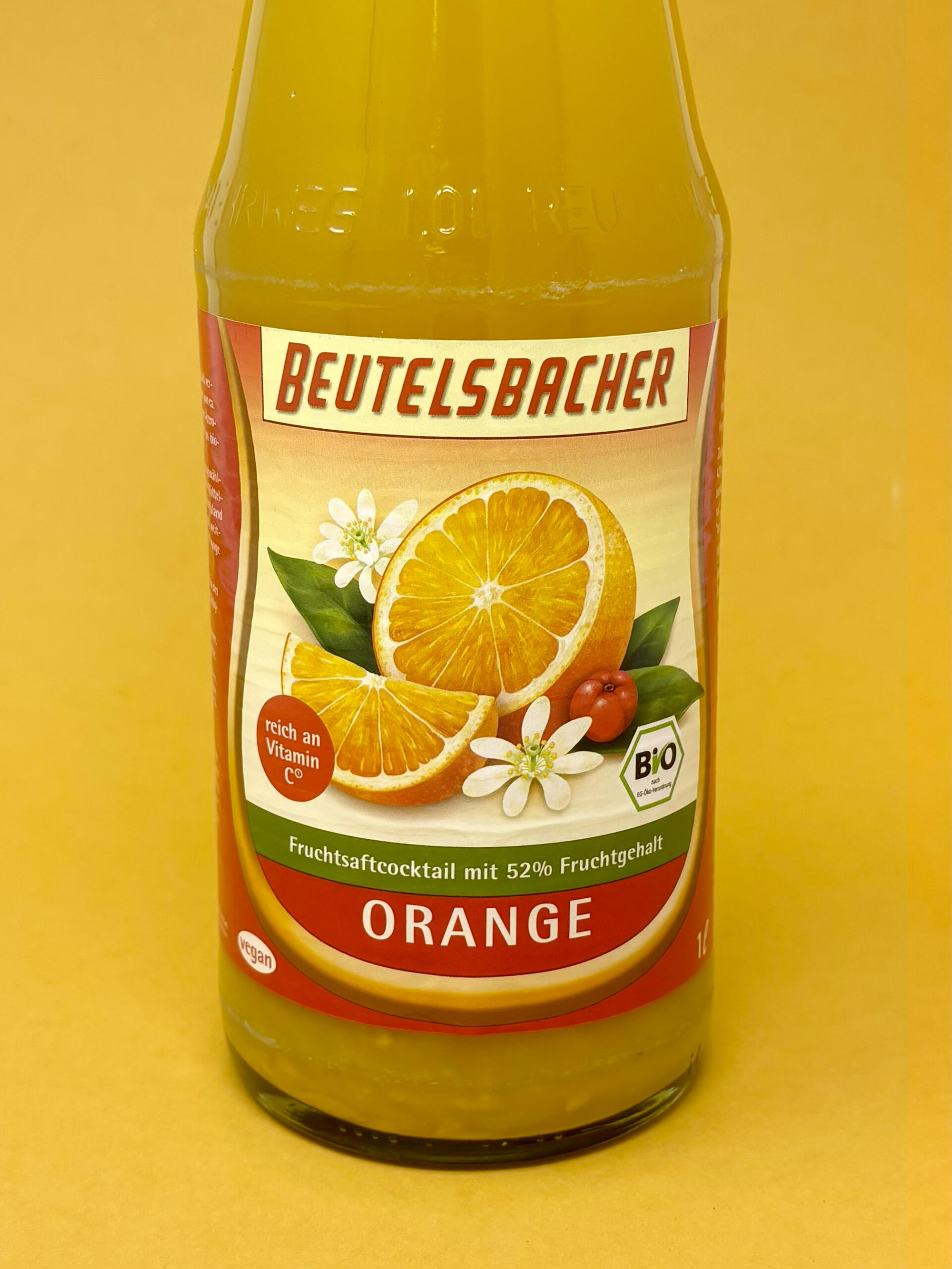 Pour notre cocktail rafraîchissant, nous utilisons le jus direct d’environ 5 oranges, riche en vitamine C, complété par les saveurs naturelles de cerises acerola et de citrons. Tous les ingrédients proviennent de l’agriculture biologique contrôlée. Les oranges et les citrons sont issus de projets de développement écologique sélectionnés dans les pays méditerranéens. Tous les fruits sont pressés dans leur pays d’origine, ce qui permet de préserver au maximum la fraîcheur et le goût du fruit. Ce cocktail de jus d’orange a le goût du soleil du Sud.