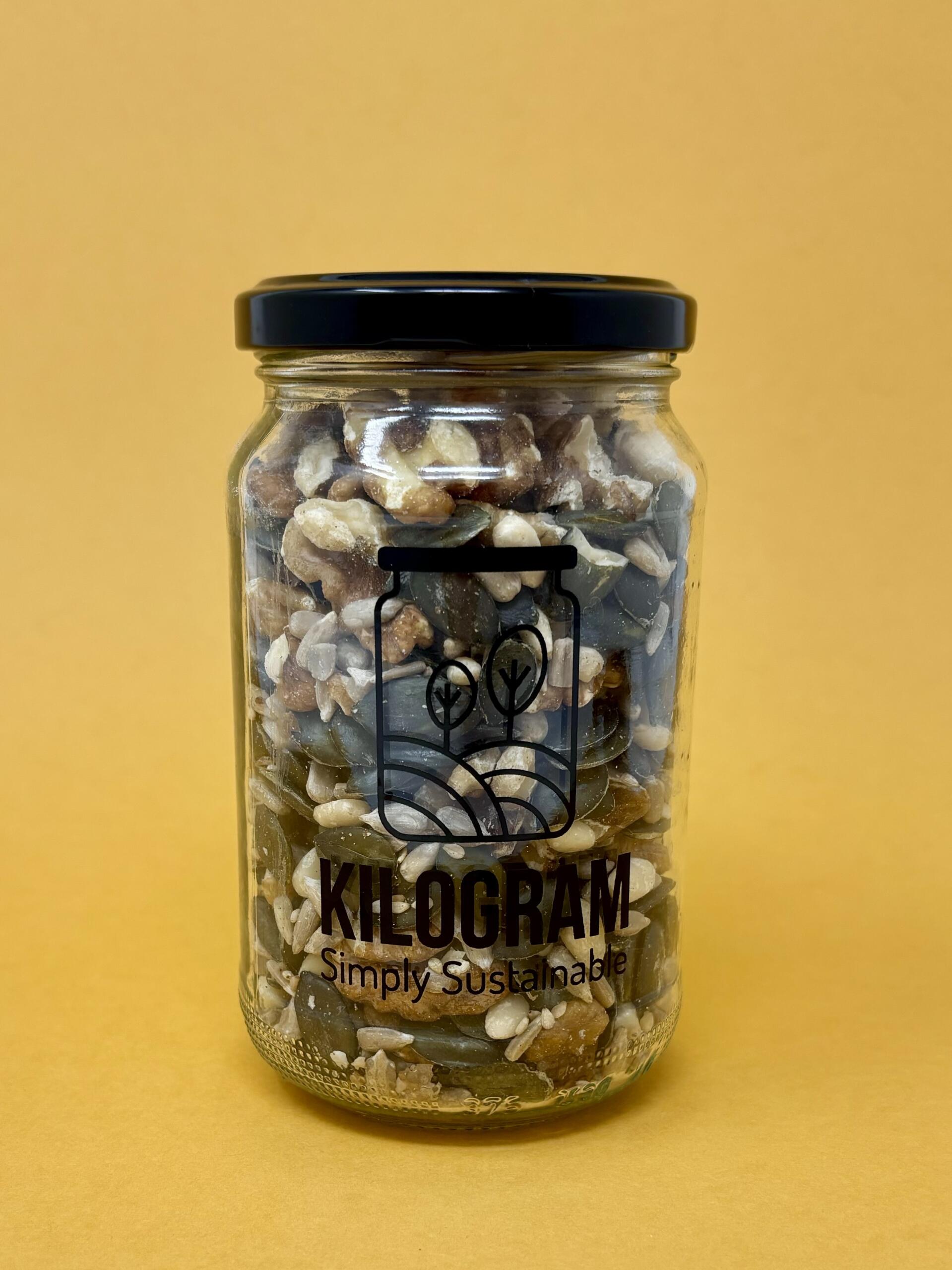 Mélange de graines (courge, tournesol, sésame, noix, pignons) pour salades, crumbles, pains ou soupes.