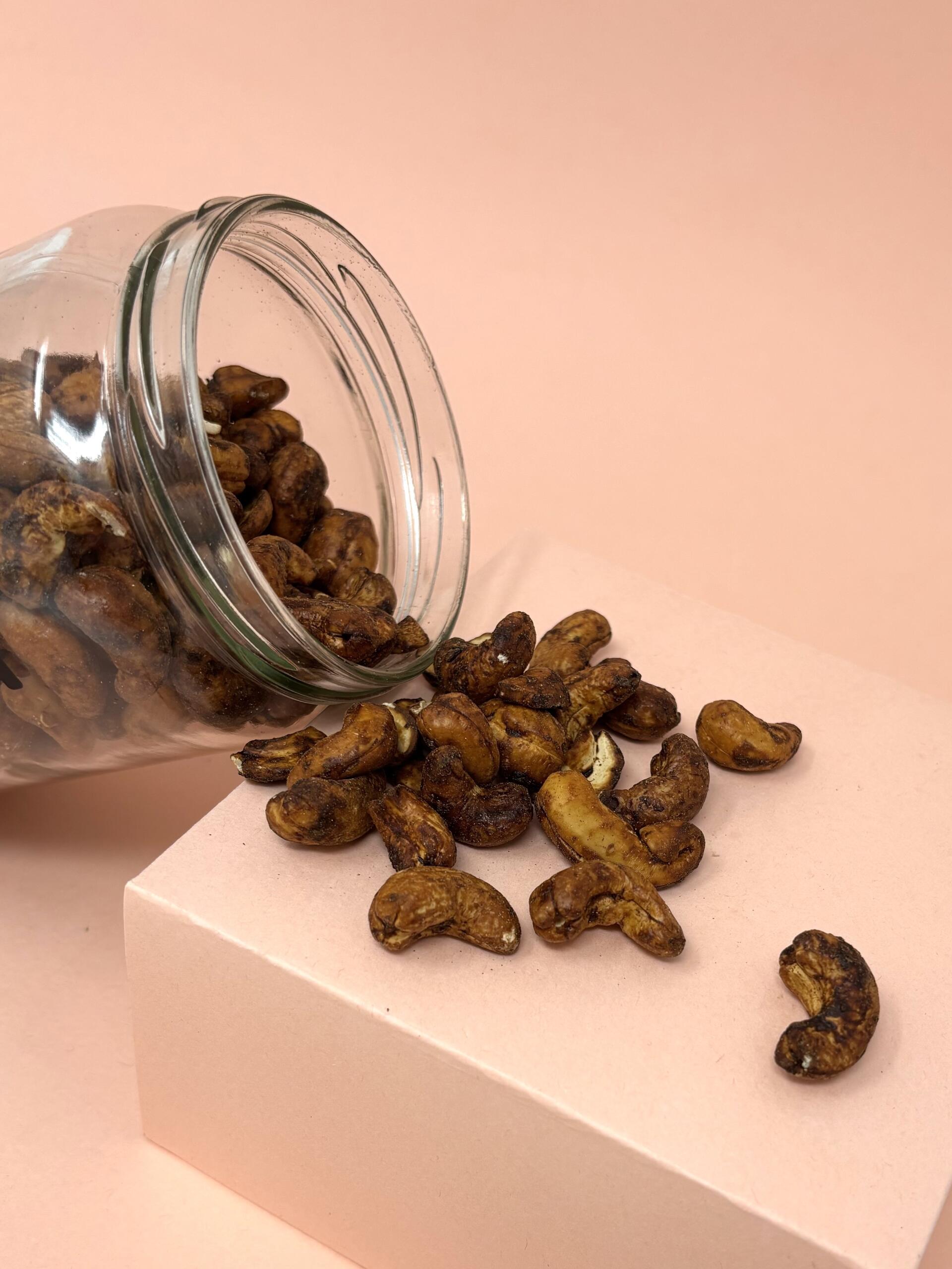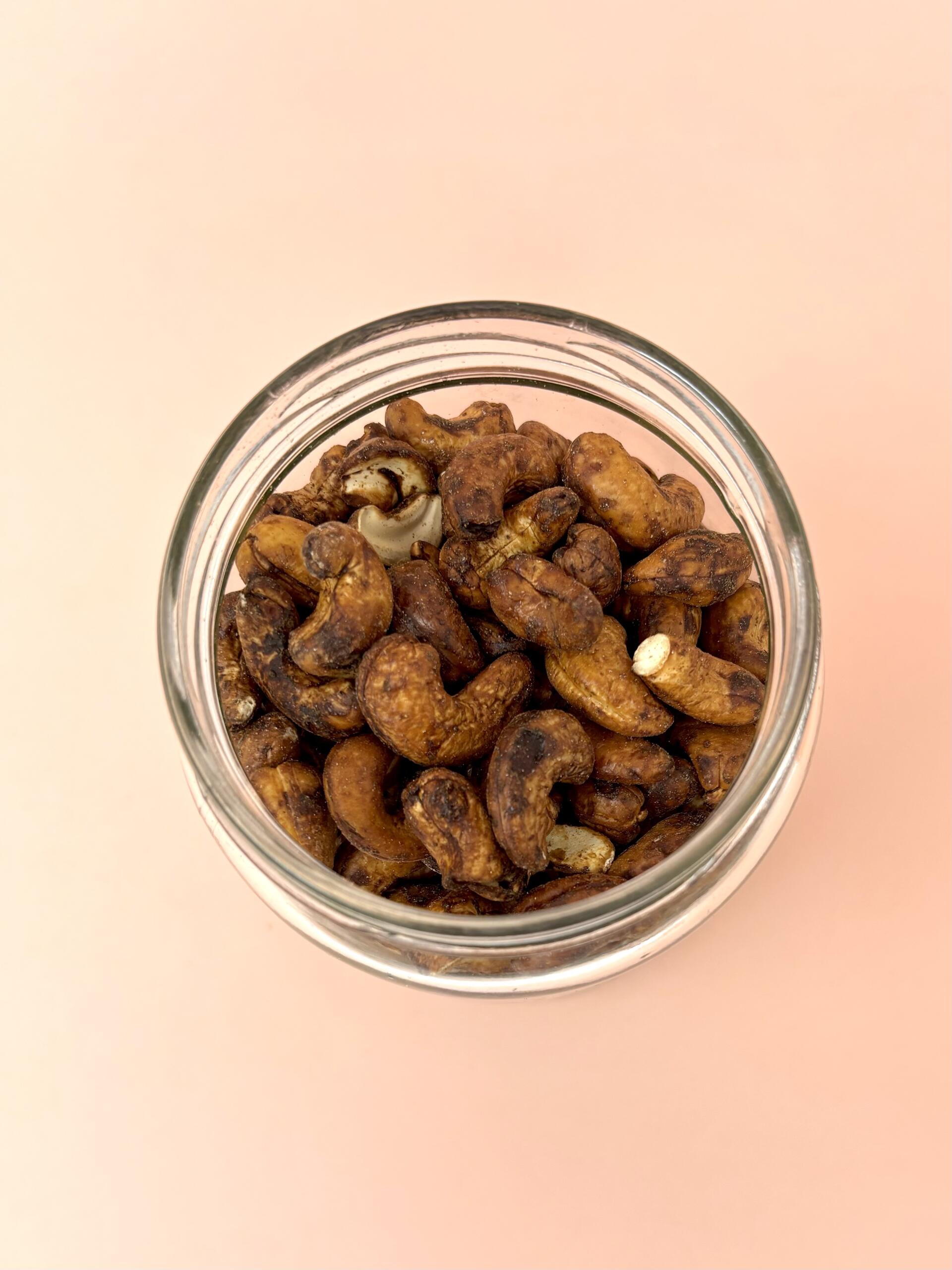 Noix de cajou enrobées de tamari, légèrement grillées, offrant une saveur umami intense, saine et riche en protéines et minéraux.
