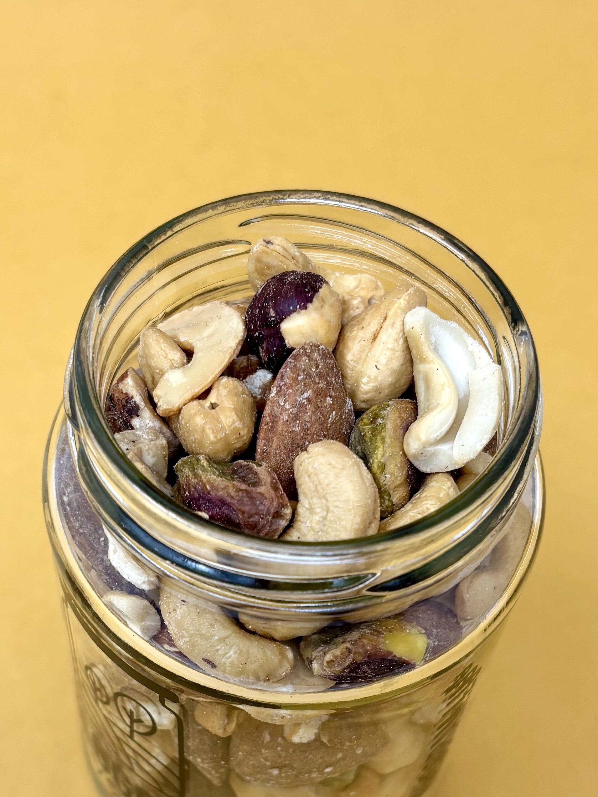 Mélange salé de noix de cajou, amandes, noisettes, noix et pistaches grillées, légèrement salées, pour une touche méditerranéenne.