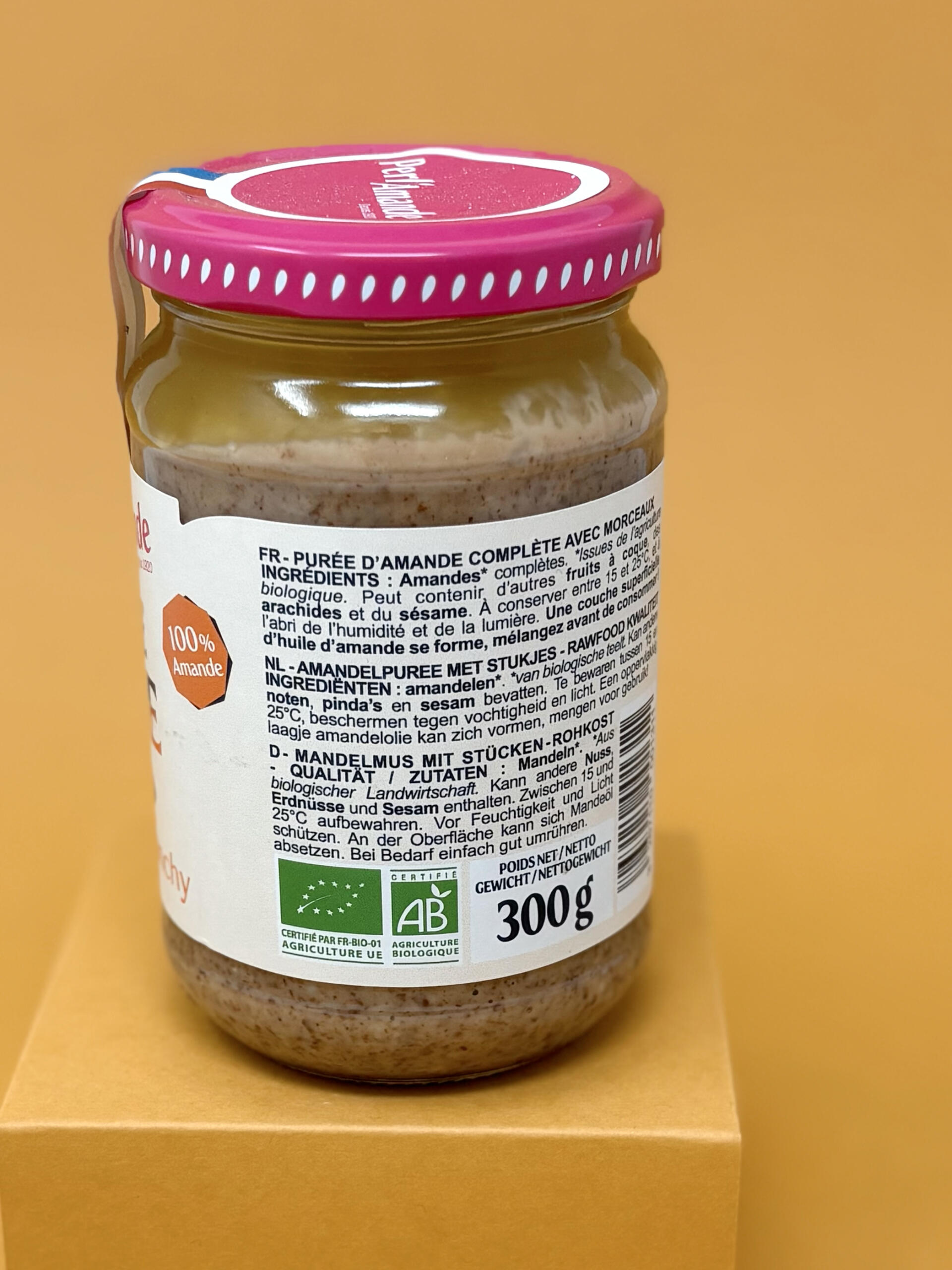 Craquez pour notre purée crue 100 % amande complète crunchy, une recette bio et savoureuse avec de vrais éclats d’amandes. Source naturelle d’acides gras insaturés, de vitamines E et B2, de fer, de magnésium, de phosphore et de potassium, elle allie plaisir et équilibre nutritionnel.
